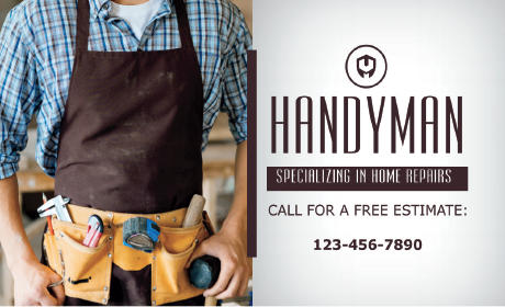 This photo business card lets your clients put a face to the name. You can use the pre-existing photo of a man with a toolbelt or upload your own photo. Include your specialty in home repairs on the front and urge people to call you for an estimate. The back of these handyman services business cards features a photo of tools.