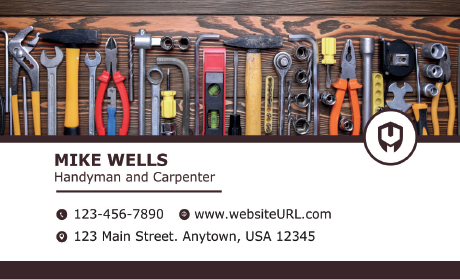 When designing business cards, you want to stand out from your competitors. Your design style should match your overall business branding. If you lean into the artisan, handcrafted style, your marketing materials should reflect that. If you focus on repairs for luxury buildings or any other specialized field, then your card should look high-end. Regardless of expertise, your handyman business logo should be included in the layout. Make sure to use complementary colors or your pre-existing branding. There are other design elements you can use as well. Illustrations of repair tools are useful, as people can immediately identify your field. Cartoons of handymen are also fun options for a more playful design. Other options include photos of tools, photos of buildings, or photos of home appliances. You could even include before and after photos of your successful repairs. Typically, a handyman business card design is simple and uncluttered, so you don’t need to worry too much about the artistic elements.