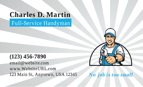 This blue business card template features a handyman icon of a man holding a wrench. This is at the center of the layout, and you can edit the text boxes to include your name and company name. The back of the business card has a gray and white striped pattern. Include your business tagline, contact information, and address.