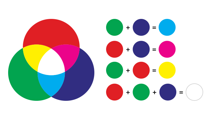 Additive colors, a projected light color system, are created by a method that combines a number of different light colors together. All the colors begin with black, or the absence of light, then different colors (or lights) are added to produce visible colors. Red, green, and blue are the main primary light colors that are used in the additive model. The combination of two of these colors will create a secondary additive color: cyan, magenta, or yellow. This creates the CMYK color wheel.