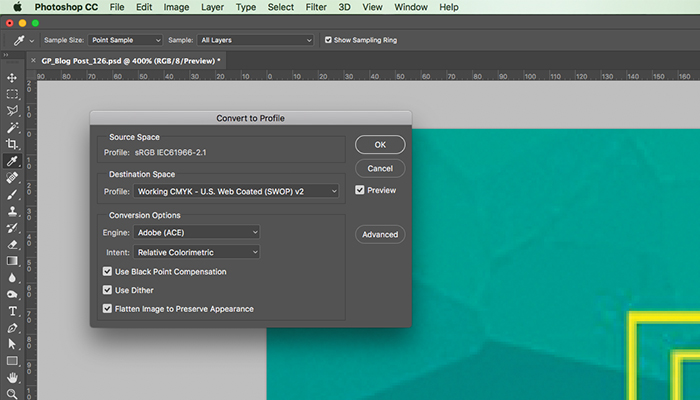 You’ll want to save a backup copy of your file before converting, and remember that the interaction of colors between layer blending modes will change when the mode changes – this is normal. You may flatten your file before converting, but it isn’t required. We mentioned before that Adobe’s Photoshop, Illustrator, and InDesign are the most common programs used for creating designs, and that all these programs rely on the RGB mode. From there, these programs make it easy to convert to CMYK and set a specific rendering intent in order to make your file print ready. This process will ensure you’re selecting the right CMYK color codes. Here’s how: