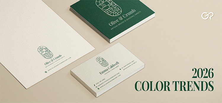 The main color trends 2026: calming neutrals, grounded earth tones, and rich shadows. Here’s how to use these visual trends to revamp your marketing materials.